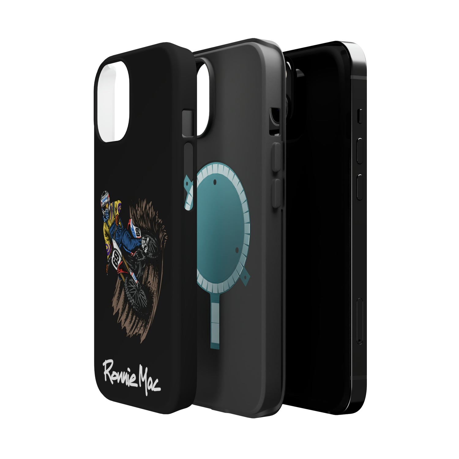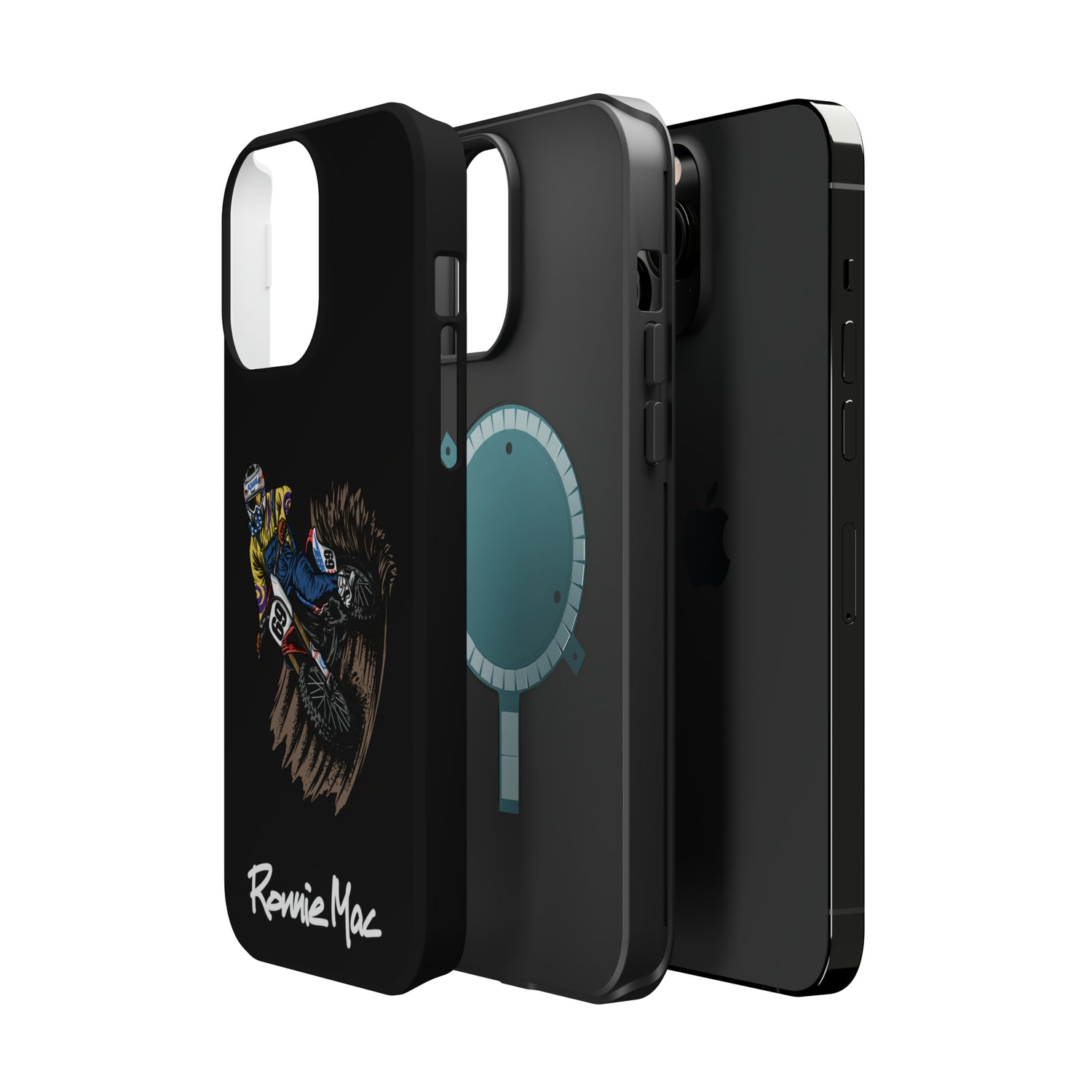 This MagSafe phone case features an electrifying graphic of Ronnie Mac in full action, masterfully berm blasting around a tight corner. The design captures the essence of his dynamic movement, with dirt flying in all directions as he navigates the turn at high velocity. It's a vivid, captivating representation that embodies the thrilling excitement of the sport, designed to make your heart race.