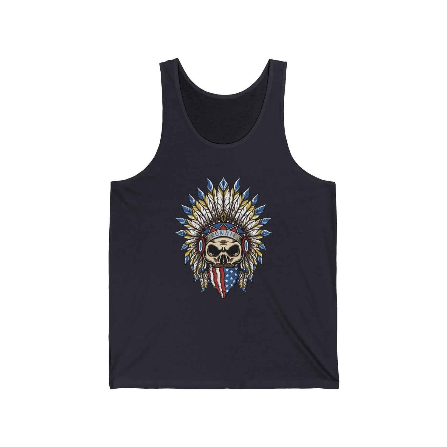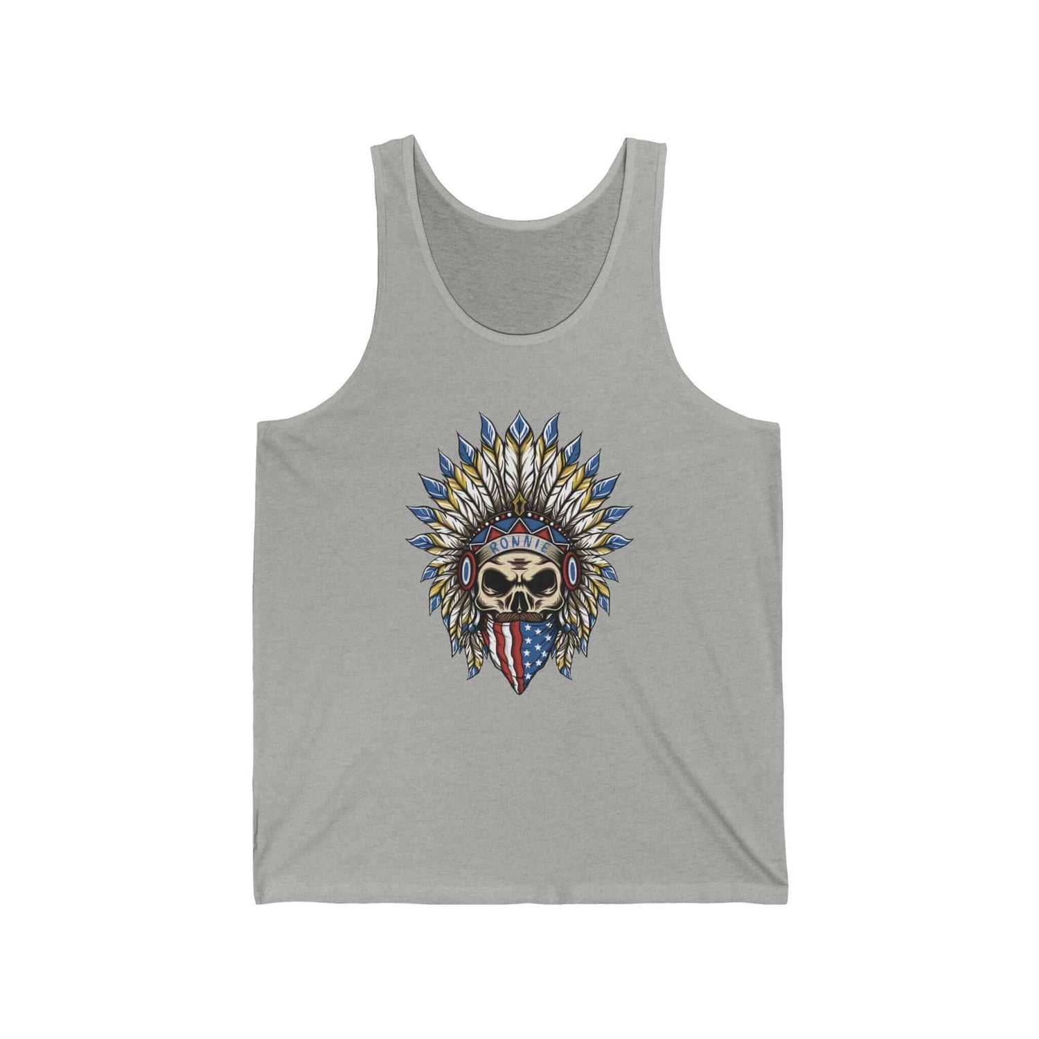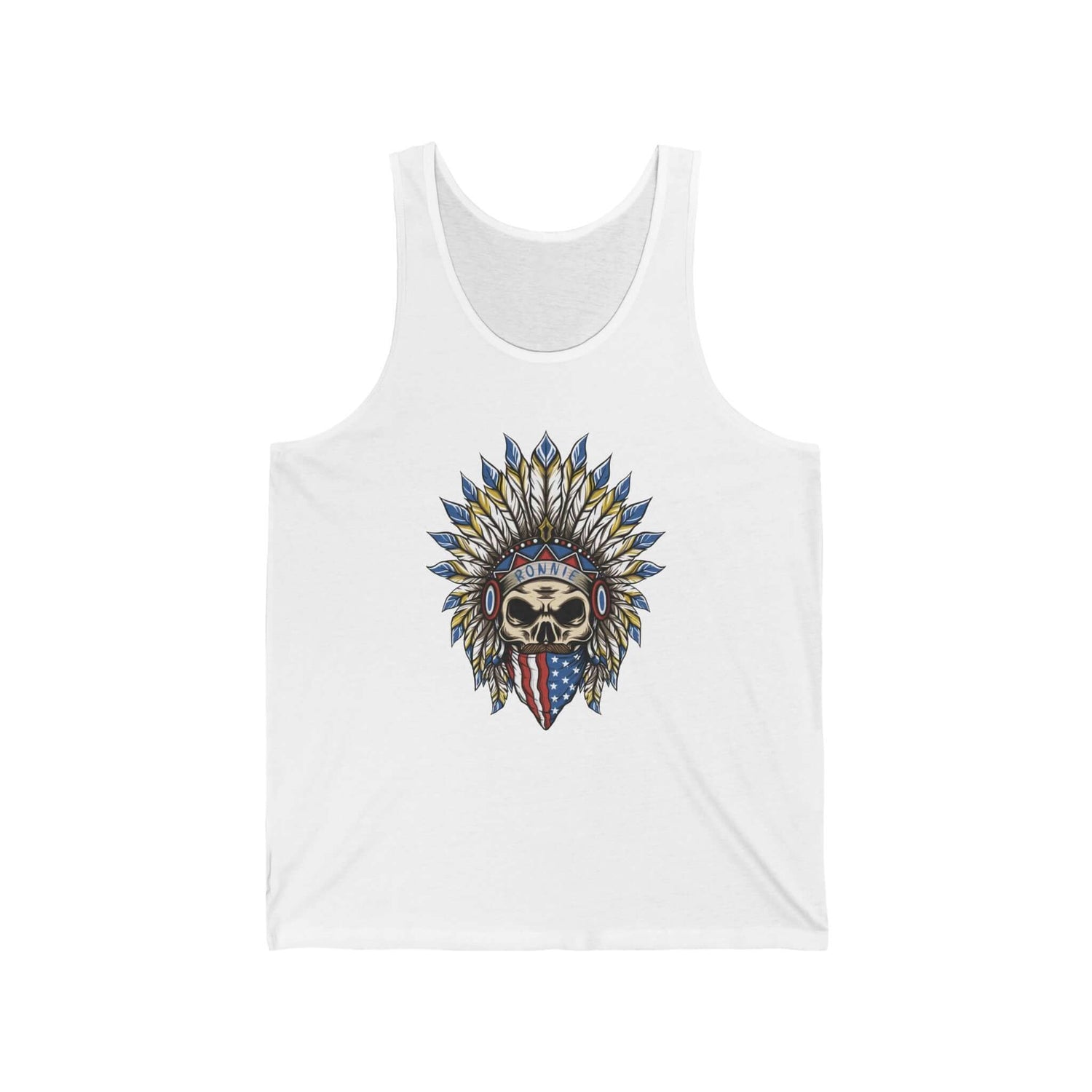 Rocking a detailed skeleton head adorned with Ronnie Mac’s unmistakable flair – an American bandana that shouts freedom and a feathered hat adding a dash of rogue charm, this tank top is perfect for those who live on the edge. Whether you're dominating the track or kicking back with your crew, this tank makes a statement loud and clear.