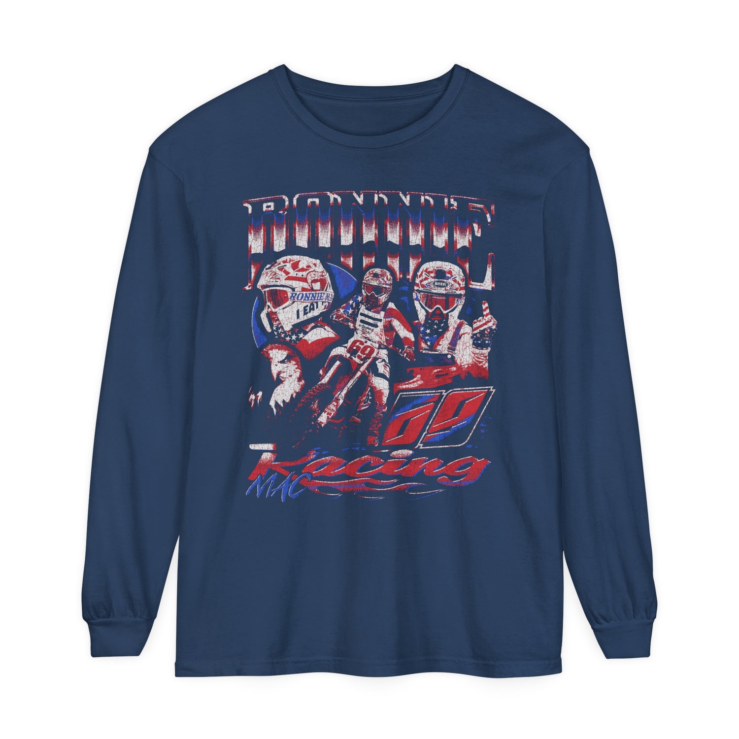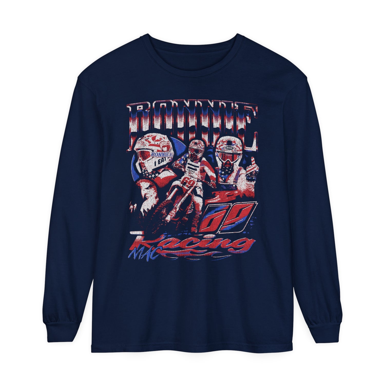 Experience the ultimate blend of style and comfort with this long-sleeve shirt, featuring none other than the legendary Ronnie Mac. This shirt is an embodiment of true American spirit, infused with Ronnie Mac's characteristic rebellious charm. The design includes iconic visuals of Ronnie Mac in his element - from giving the world his trademark salute to blasting berms like a pro.